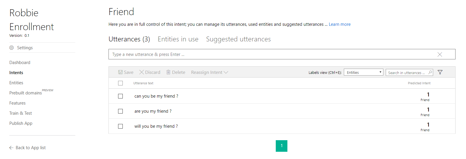 1. Step one is to add a new Intent to LUIS. Just login, add an intent and start adding utterances. We’ve added three utterances that help LUIS in recognizing this new intent: