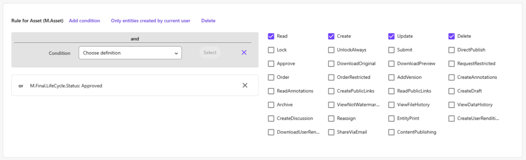 Clicking the “Only entities created by current user” button creates a “Condition Created by current user” that allows you to give a user more rights on their own assets, which you could also limit to the LifeCycle.Status ‘Created’ of course, so users would only have additional control up until an asset would be under review or being approved.